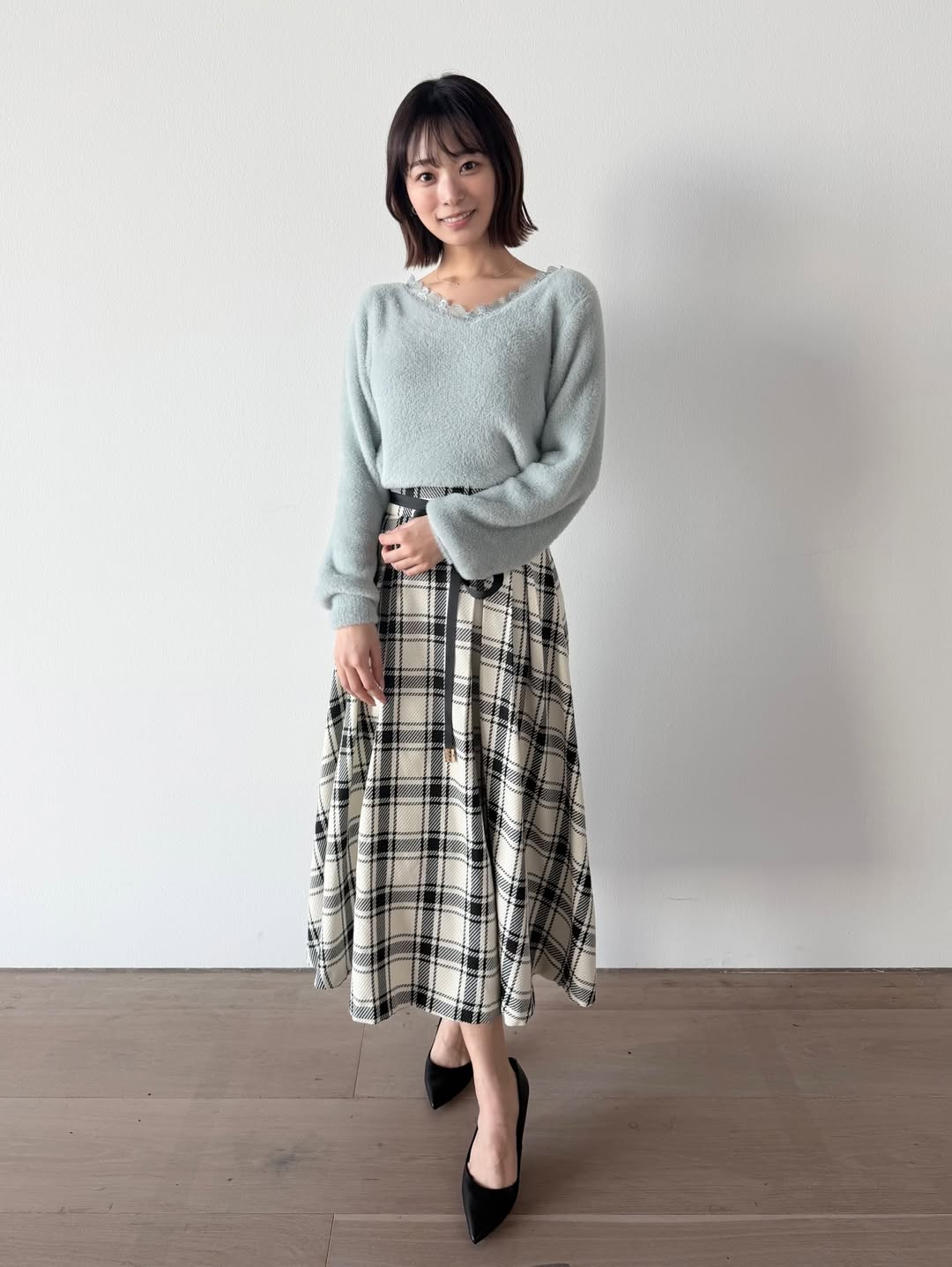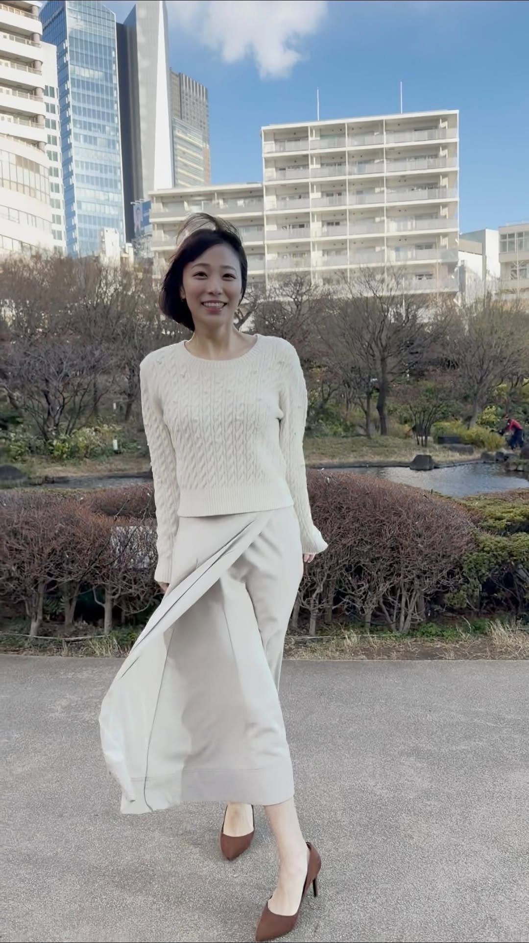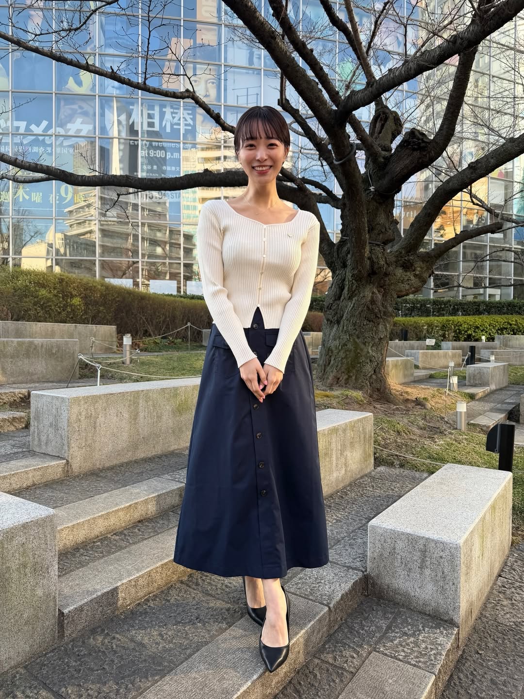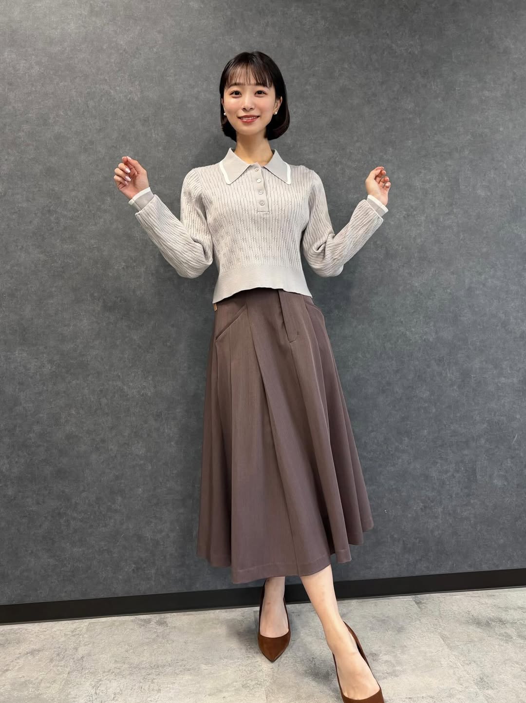 特に注目されたのは、上品さとスタイルの良さを際立たせるバランス感覚だ。過度な装飾を避けたミニマルなコーデでありながら、ヒールの美しいラインが脚のシルエットを引き立て、洗練された印象を強調。普段の気象情報で見せる知的で落ち着いたイメージとはまた違った魅力が垣間見える一枚となっている。